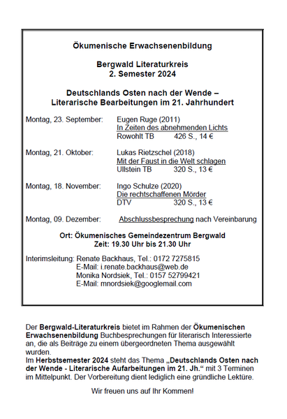 Der Bergwald-Literaturkreis bietet im Rahmen der Ökumenischen Erwachsenenbildung Buchbesprechungen für literarisch Interessierte an, die als Beiträge zu einem übergeordneten Thema ausgewählt wurden.